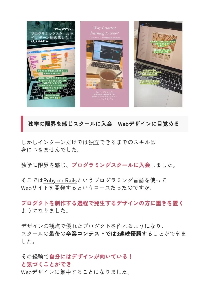 現役のWebデザイナーから直接指導を受けることで、実践的な知識や経験を得られます。成功した事例や実際の体験を基に、具体的な解決策を提示します。